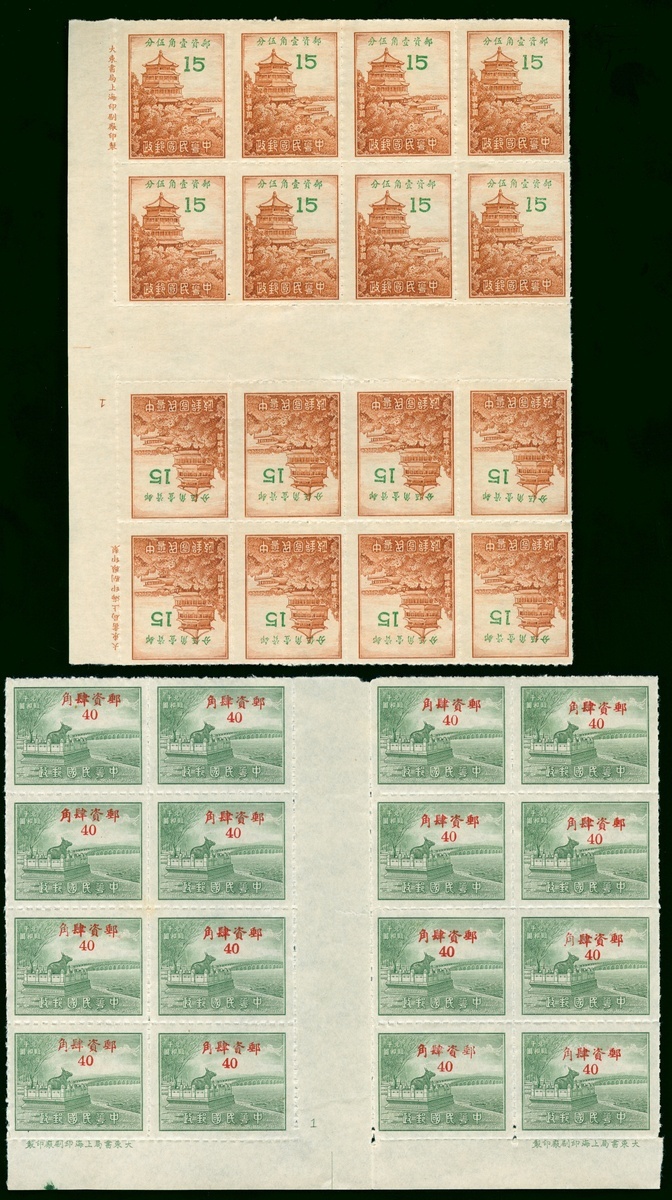1949 Peiping Summer Palace Scenery Silver Yuan Issue, two block of 16, with interpanneau and imprint margin. unused.