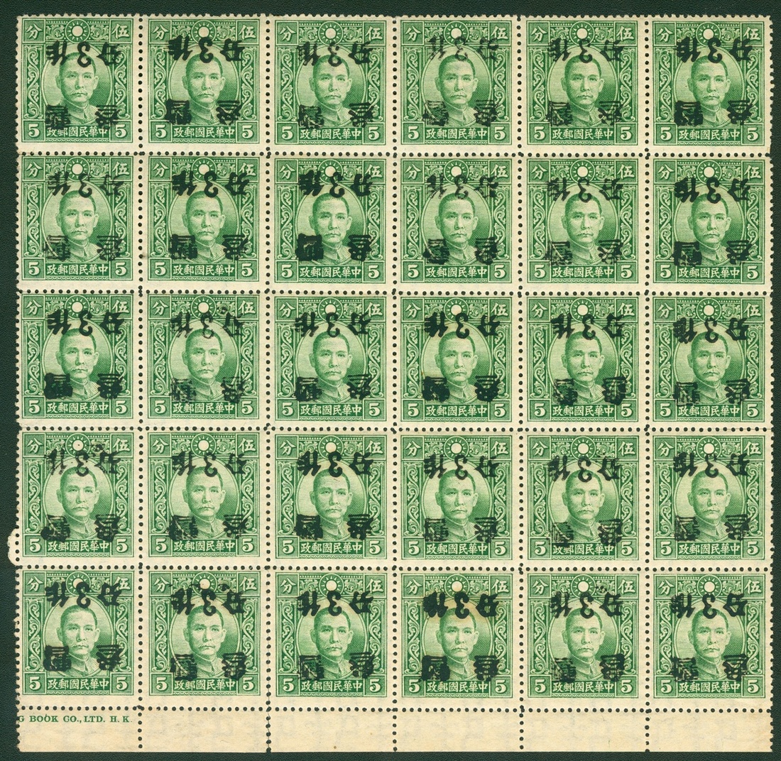 1940 Kansu surcharge of 3 cent, block of 30, unmounted mint, all with inverted overprinted variety. Chan 448c.