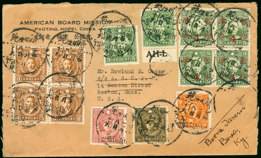 1941 (8 Feb.) a cover to U.S.A. bearing Martyrs ½c., 2 ½c., 3c. block of 4, 8c. and SYS 3c. on 5c.(Shanghai), 4c. on 5c. blocked 4, tied by Paoting c.d.s., cover flat lost.