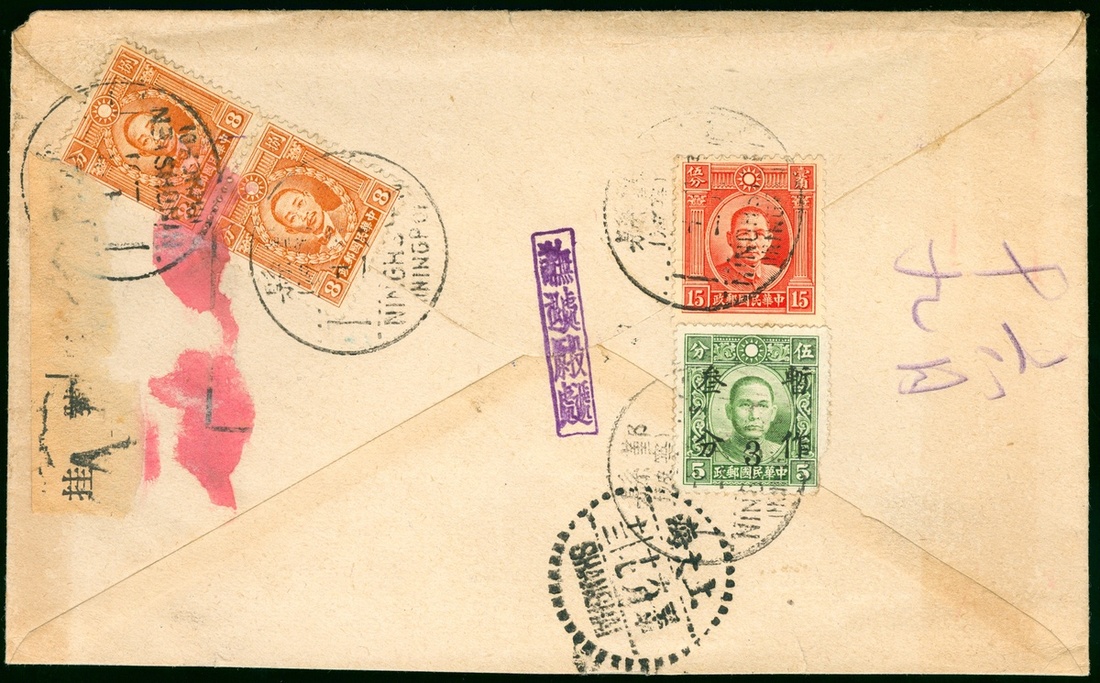 1941 (11 Jun.) a double registered cover to Shanghai bearing Martyrs 8c. pair and SYS 3c. on 5c.(East Szechwan), 15c. tied by Ningpo c.d.s., Shanghai (17.6) arrival c.d.s.
