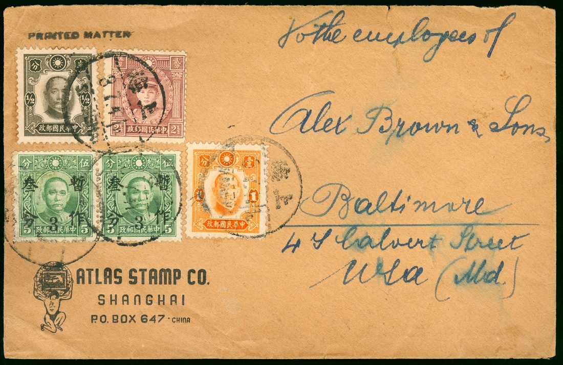 1941 (3 Jul.) a cover to U.S.A. bearing Martyrs 2 ½c. and SYS New York print ½c. and 1c., 3c. on 5c.(East Szechwan) pair, printed matter rate 10c. tied by Shanghai c.d.s., ½c. postal used scarce.