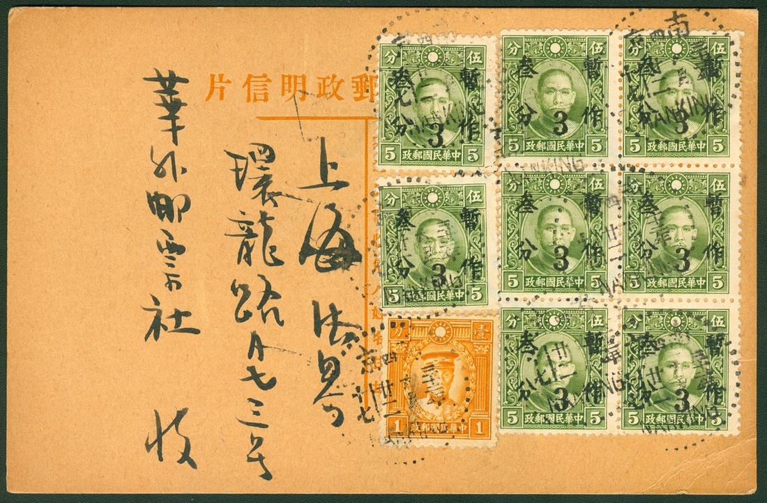 1943 (22 Jun.) a SYS stationery card to Shanghai(23.6) bearing Hunan surcharge 3c. on 5c. x 8 and Martyrs 1c. total 25c. rate tied by Nanking c.d.s.