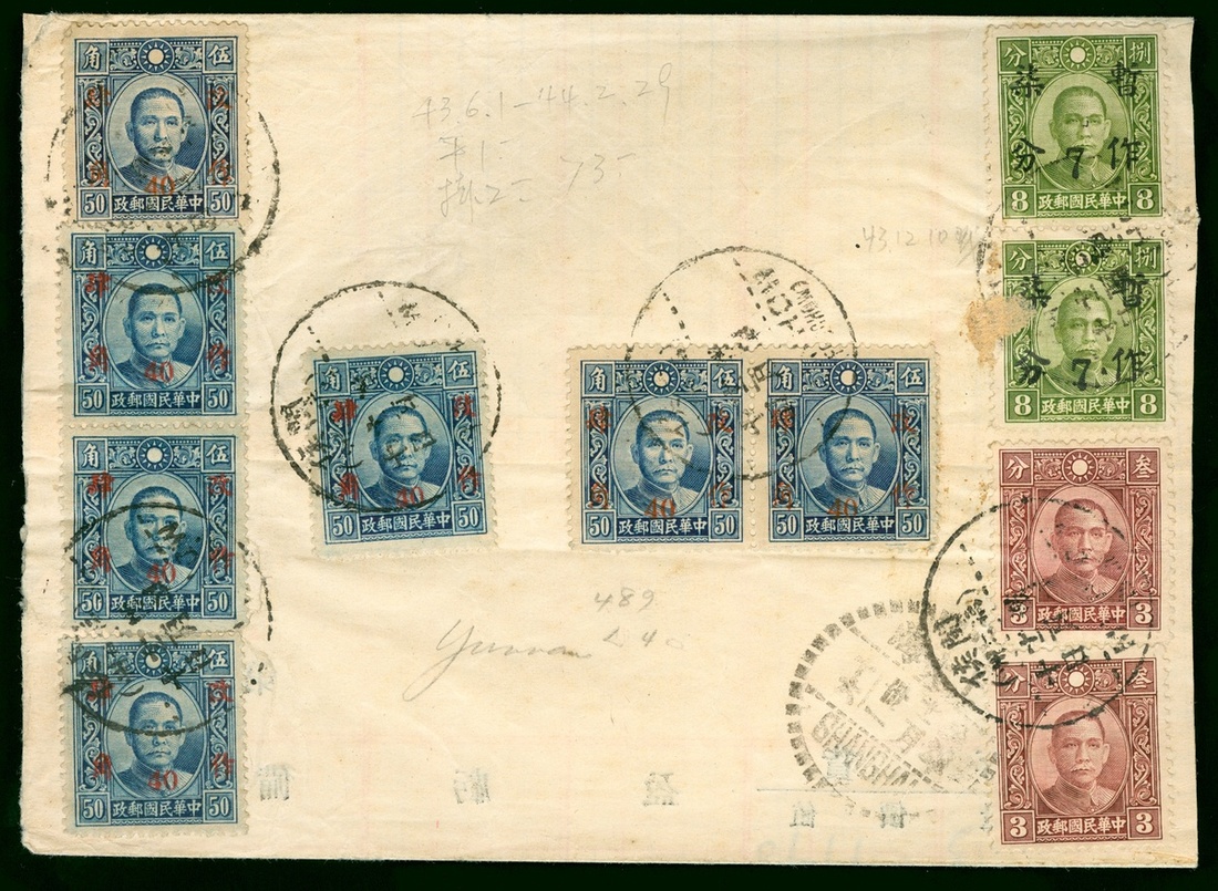 1943 (10 Dec.) Foochow to Shanghai registered cover, on the reverse bearing Dr.Sun surcharge 40c. on 50c.(7) and 7c. on 8c. (2), 3c.(2), tied by Minhou (Foochow)c.d.s., Shanghai 31 Dec. arrival c.d.s. alongside.