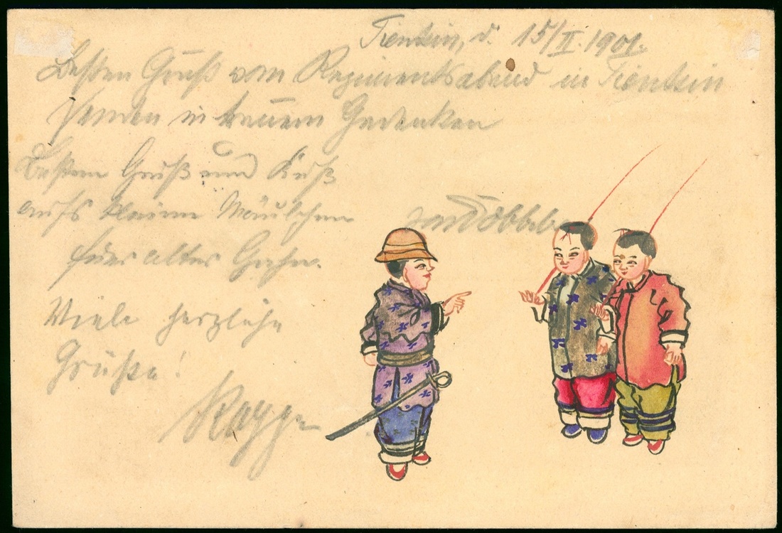 1901 (16 Feb.) China 1c Pre-stamped Postcard with hand painting on reverse, to Germany, with arrival c.d.s.