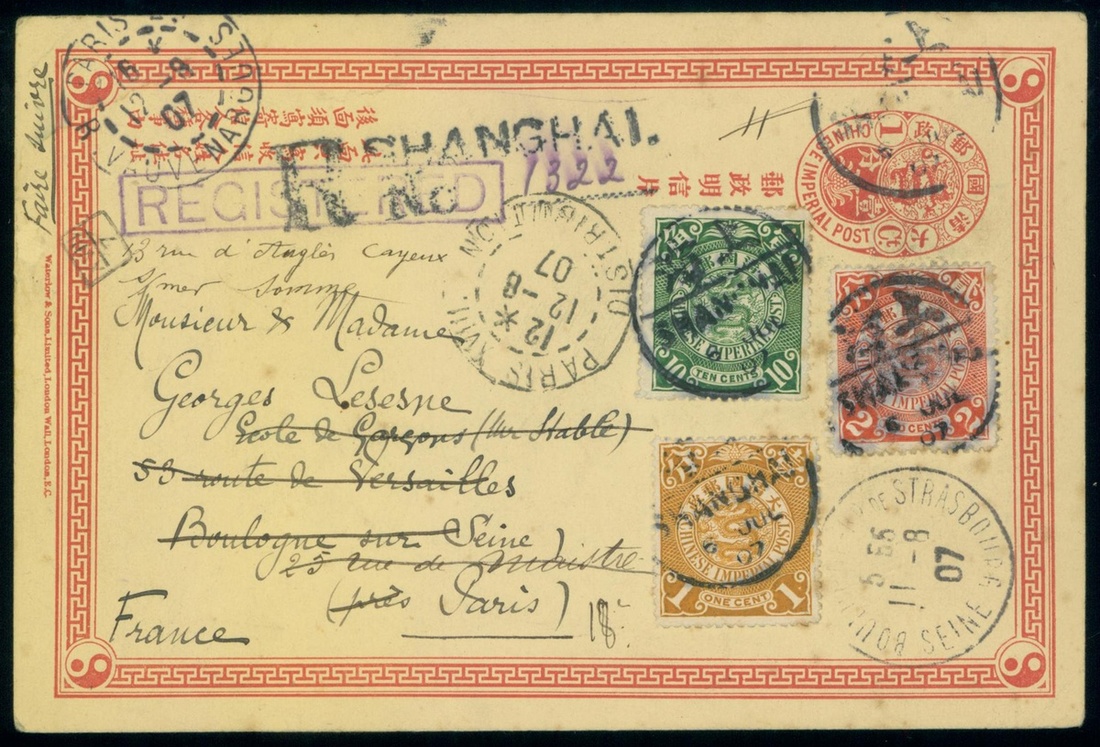1907 (6 Jul.) registered 1c card to Paris unprated with C.I.P. 1c, 2c, 10c tied by Shanghai c.d.s., Paris arrival (12.8), "The more sons. the more blessings" handpainting and Russo-Chinese Bank in Shanghai h.s. alongside.