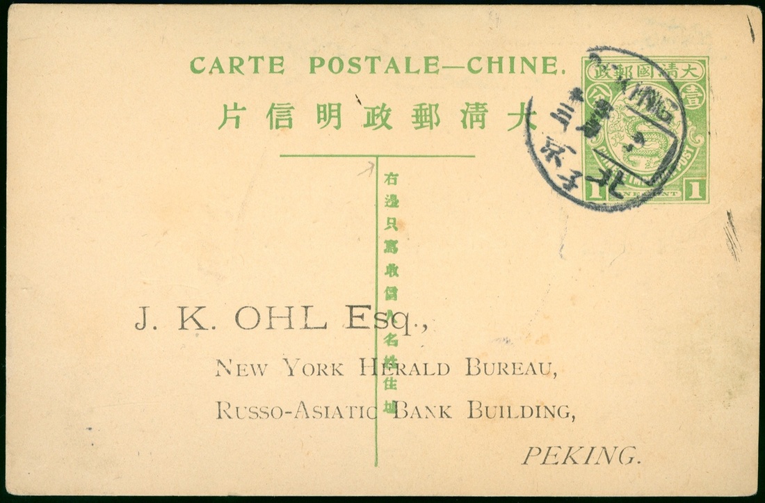 1910 (13 Nov.) 1c pre-stamped postcard, tied by Peking c.d.s.