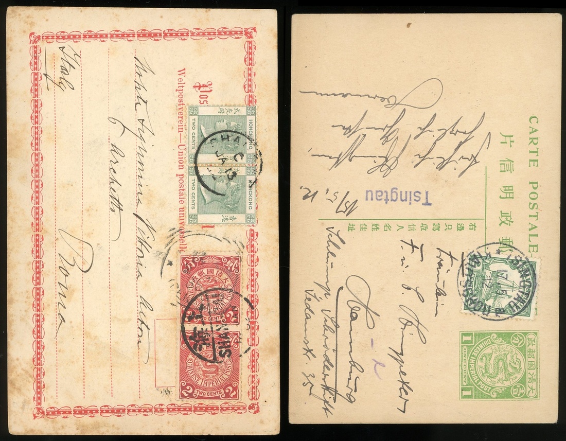1912 (17 May) bearing Kiautschou 2 c. tied by Tsingtau c.d.s. plus other postcard mixed coiling dragon and Q.V. send to Italy, both with hand painting on reverse.