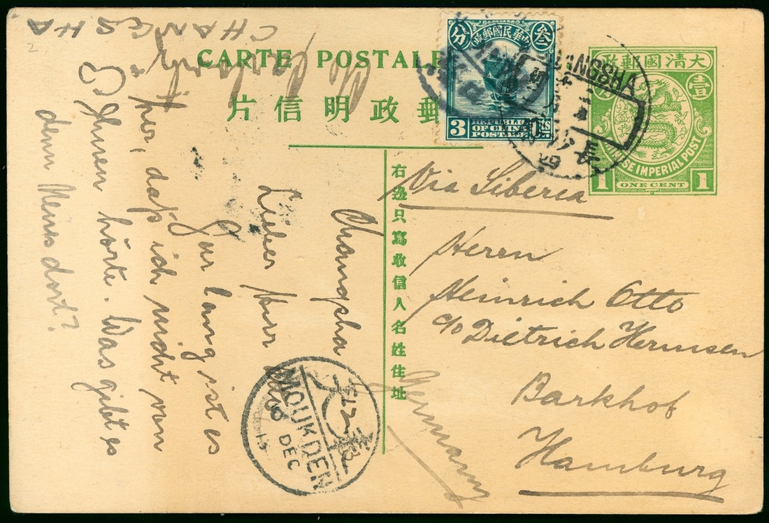 1913 (2 Dec.) 1c stationery card from Changsha to Germany, uprated by 3c London Print Junk tied by Changsha c.d.s. with Hankow and Moukden transit c.d.s. (10.12). Interesting combination and fine.