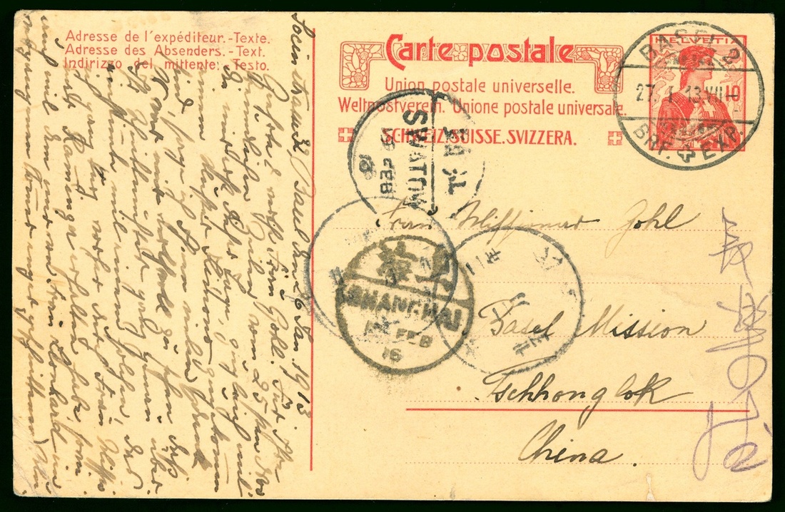 1913 (27 Jan.) 10c postage postcard from Basel, Switzerland to Chonglok, Kwangtung. Cancelled byBasrl c.d.s., transit by Swatow and Shanghai, along with Chonglok 25 Feb. arrival c.d.s.