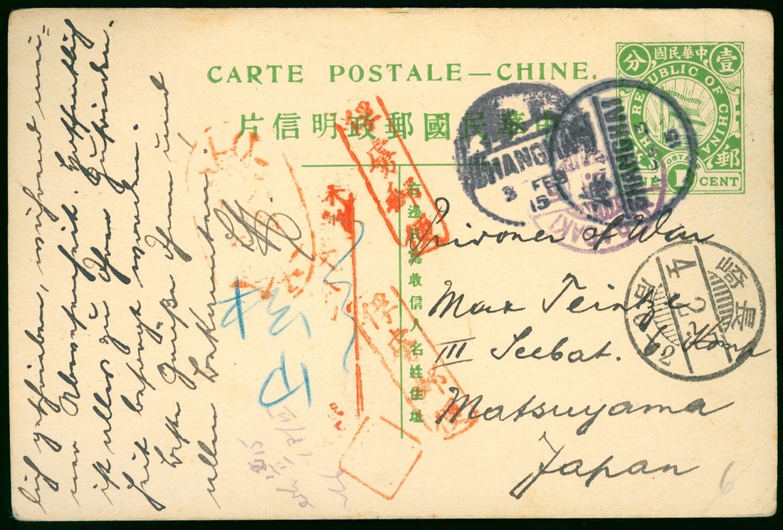 1915 (3 Feb.) Republic of China 1c pre-stamped postcard to Japan, tied by Shanghai c.d.s., Matsuyama arrival c.d.s. and Red Captive post cachet