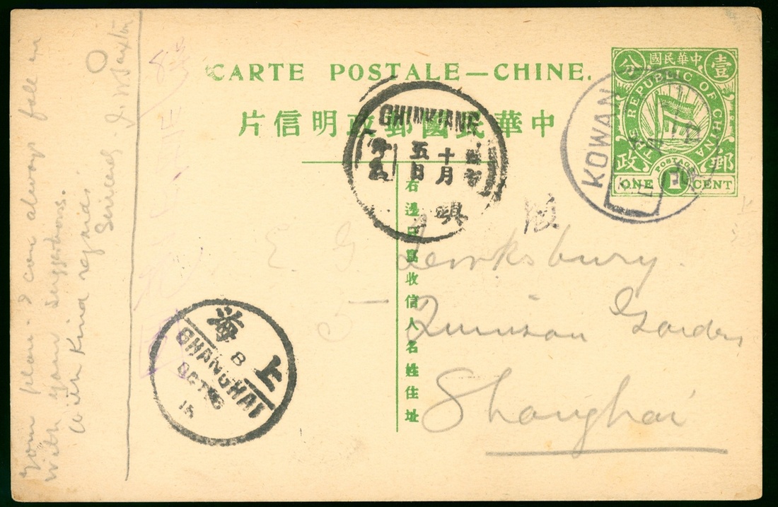 1915 (5 Oct.) 1c. to Shanghai tied by Kowan via Chinkiang