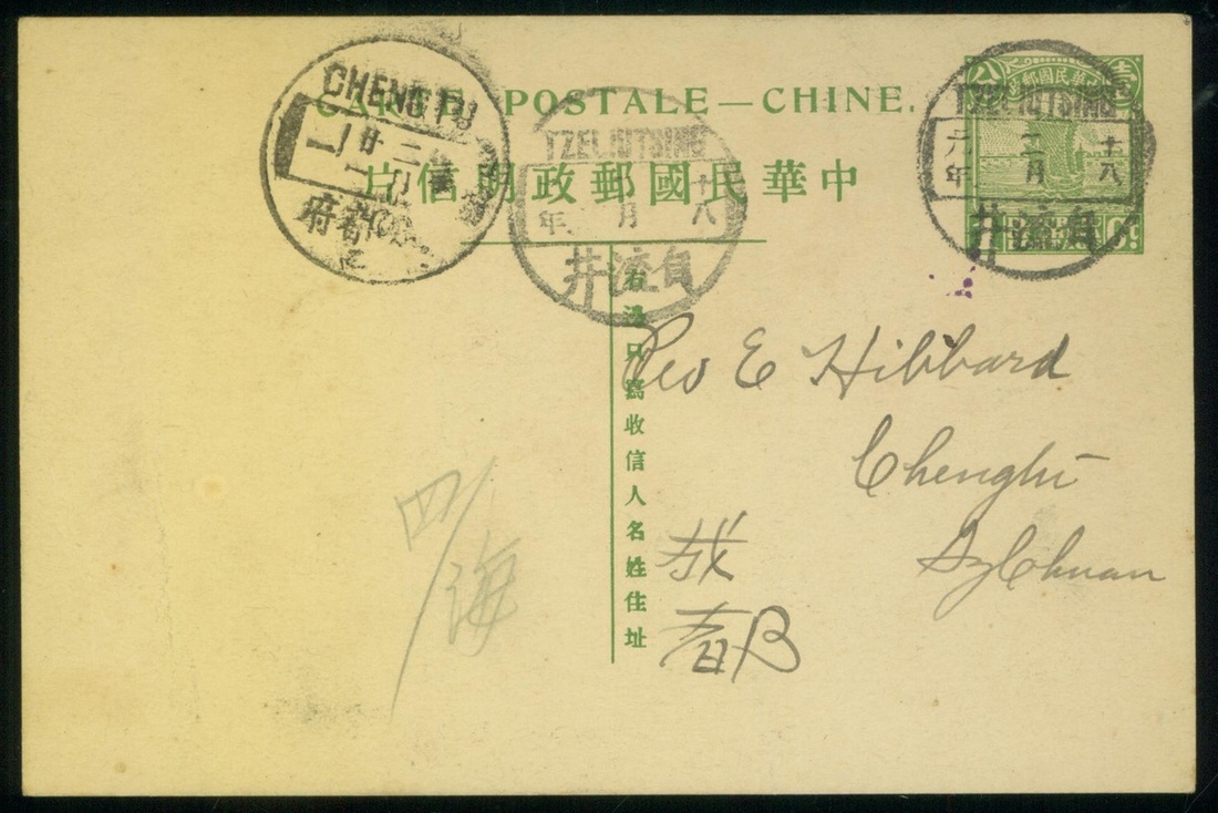 1916 ( 18 Feb.) Tzeliutsing to Chengtu 1c. postage postcard, tied Tzeliutsing "Hung sien" 1st year c.d.s., Chengtu 21 Feb. arrival c.d.s. beside.