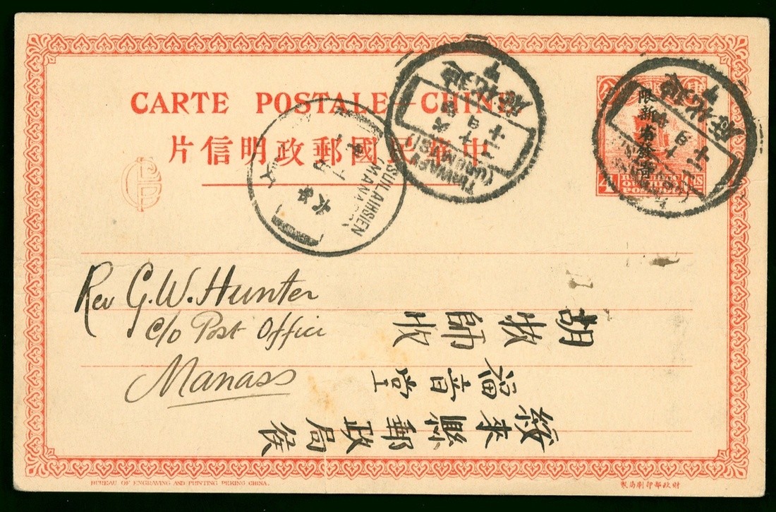 1917 (20 Oct.) Tihwa to Suilaihsien First Issue overprinted "Limited For Use in Sinkiang Province"4c. postage card, tied by Tihwa c.d.s., 21 Oct. Suilaihsien arrival c.d.s. alongside. the card has pre-print fold variety at bottom. the non-philatelic usage of this card is very rare, especially a used card with printing error. Very fine.
