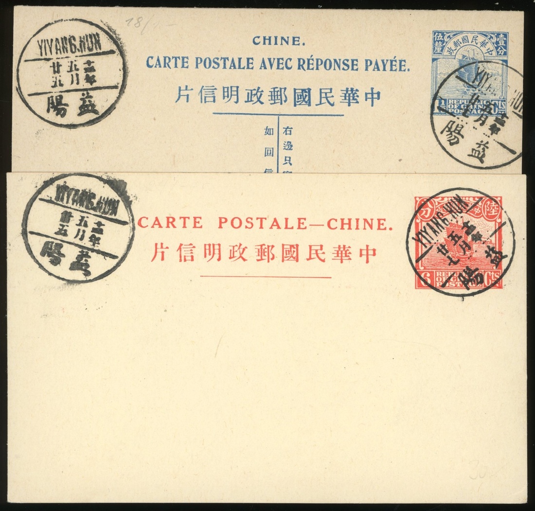 1924 (27 May.) 1 1/2c + 1 1/2c blue reply paid double card, and 6c stationery card, both tied by Yiyang c.d.s. fine. (2)