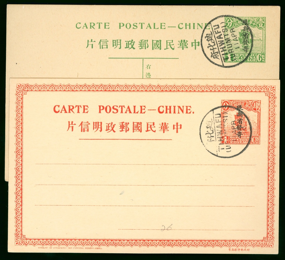 1c and 4c card overprinted with "Restricted for Use in Sinkiang" tied by Tihwafu (Urumtsi) bilingual c.d.s. (2)