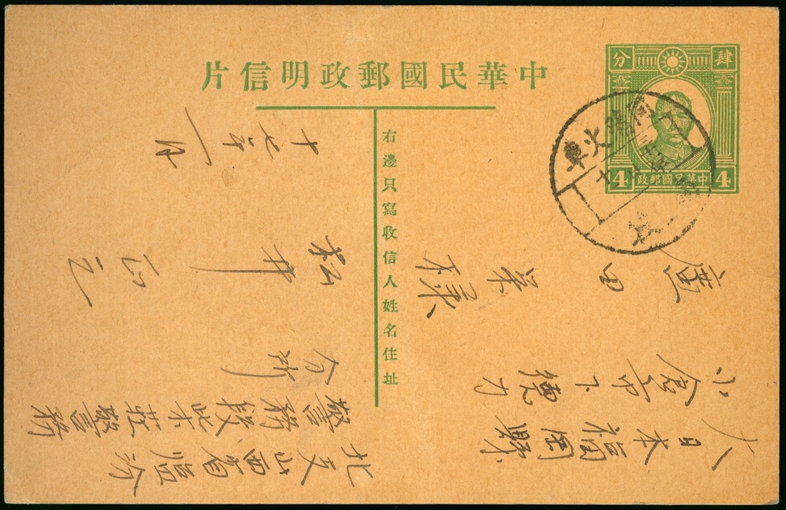 1942 (12 Jan.) 4c card from Linfen, Shansi to Japan tied by Tungpu (South) railway c.d.s. fine.