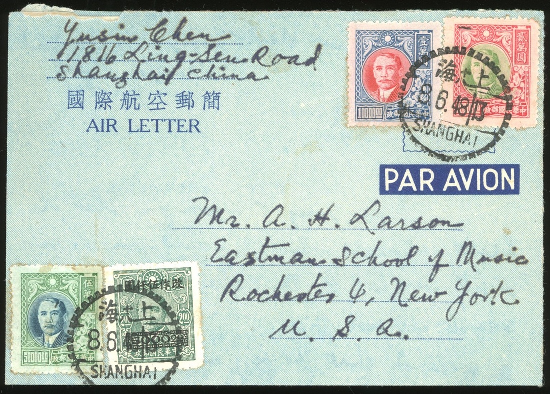 1948 (8 Jun.) China Air Letter from Shanghai to USA, f.w. 4 Dr. SYS stamps, total rate $85000, tied by Shanghai c.d.s.