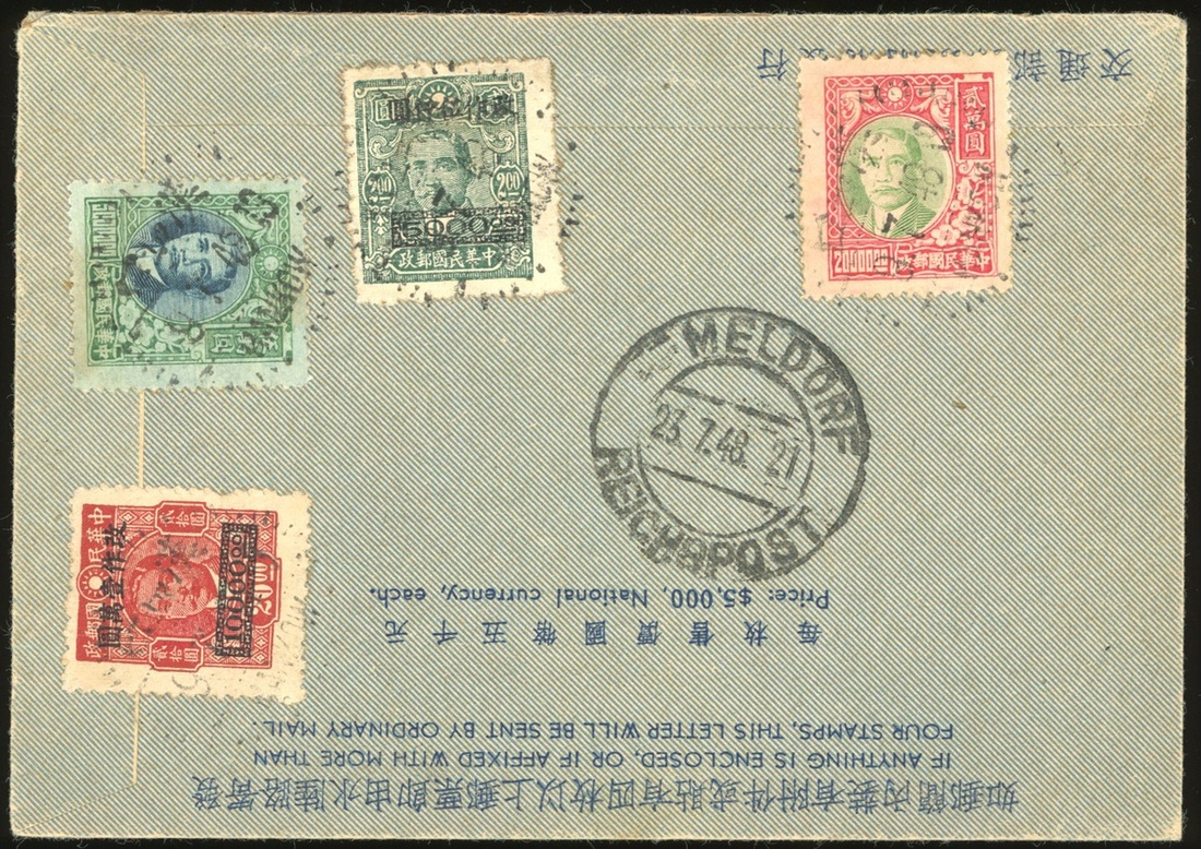 1948 (9 Jul.) China Air Letter from Hankow to Germany, f.w. 4 Dr. SYS stamps, total rate $85000, tied by Hankow c.d.s. and Meldorf arrival c.d.s.
