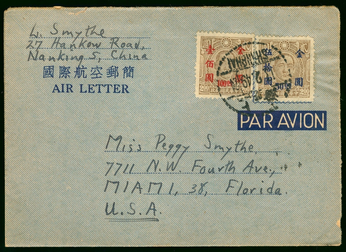 1949 (13 Feb.) an aerogramme to U.S.A. bearing G.Y. $50 on $2 and $100 on $2 tied by Shanghai c.d.s.