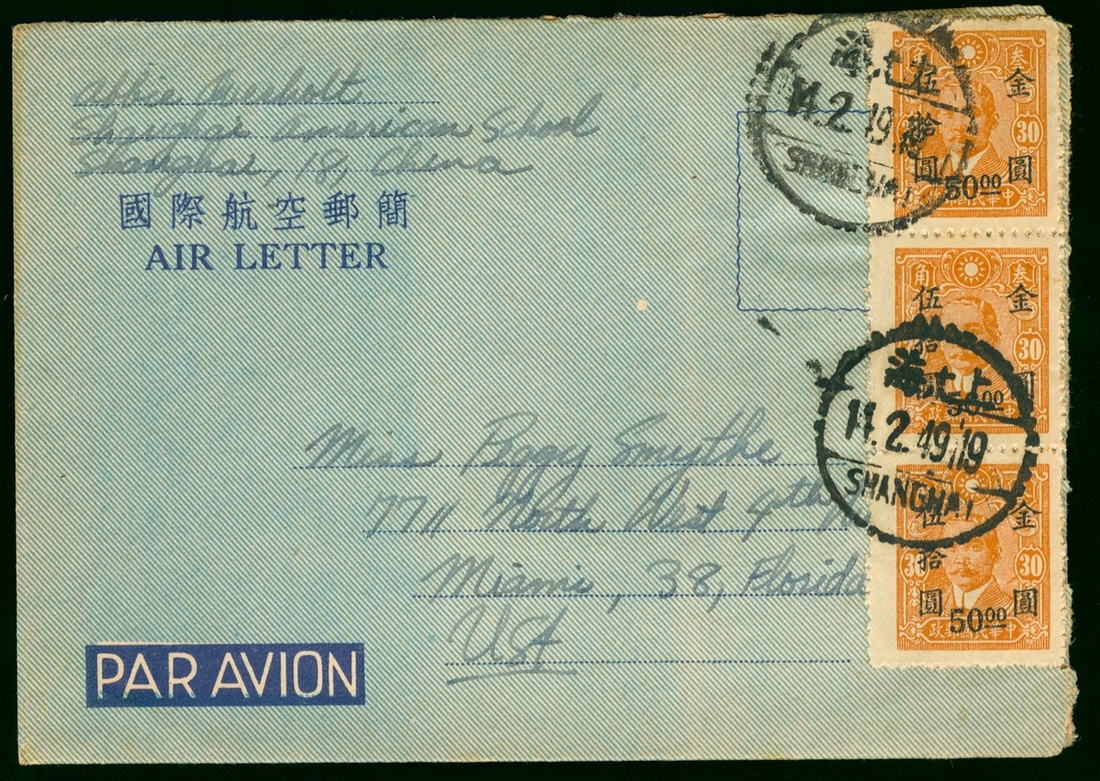 1949 (14 Feb.) an aerogramme to U.S.A. bearing G.Y. $50 on 30c. vertical stripe of three tied by Shanghai c.d.s.