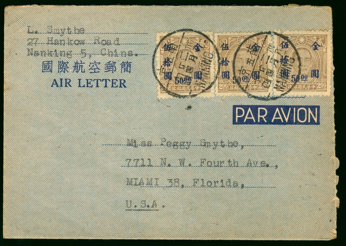 1949 (24 Feb.) an aerogramme to U.S.A. bearing G.Y. $50 on $2 x 3 tied by Nanking c.d.s.
