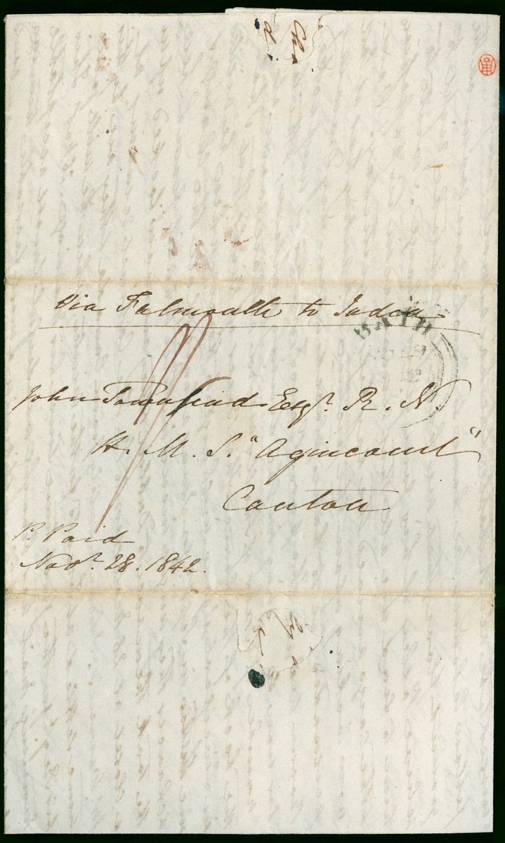 1842 (29 Nov.) Bath, England to Canton early stampless envelope, with Bath c.d.s. on address side. this letter was sent to HMS "Agincourt", at that time this ship was in Canton after Opium War.