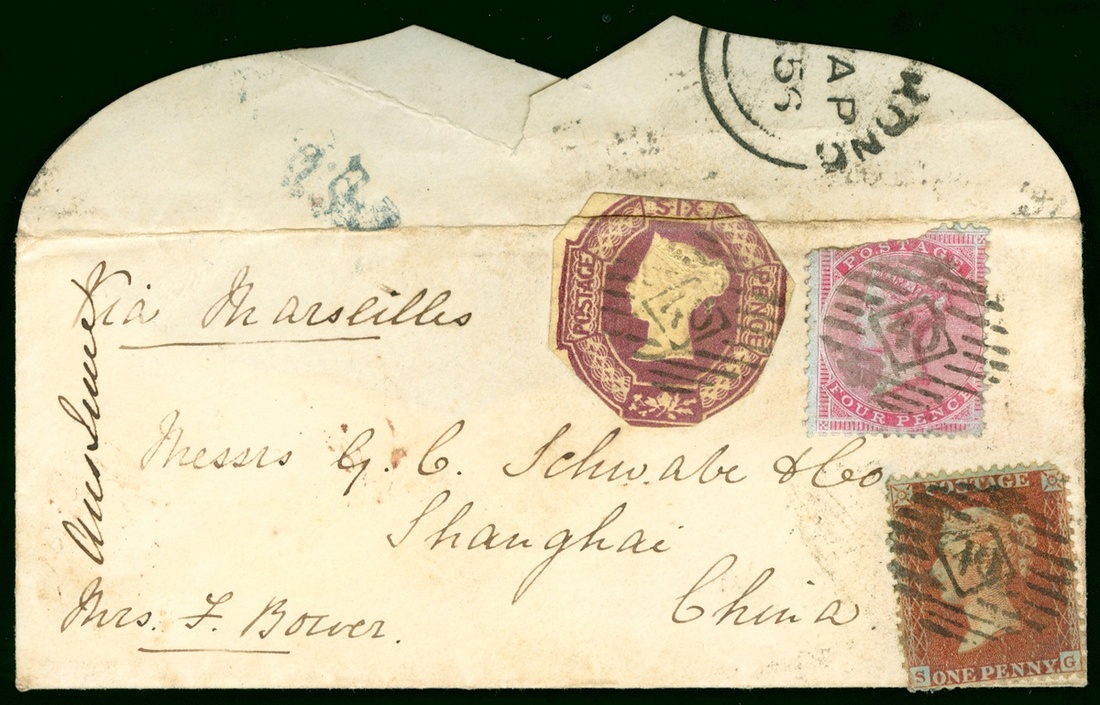 1856 (10 Mar.) envelope from England to Shanghai bearing G.B. stamps (3) tied by G.B. cancellation, with Hong Kong transit c.d.s. (27.4).