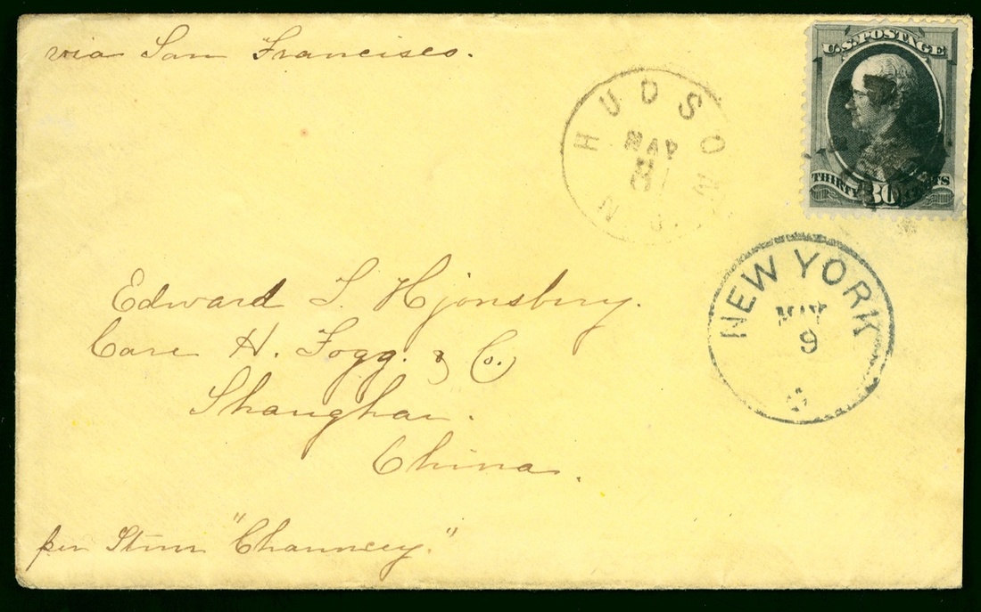 1870s U.S.A. to Shanghai cover, bearing U.S.A.avatar.30c., tied by 8 May Hudson c.d.s., and with New York 9 May transit c.d.s., it is rare from U.S.A. to Shanghai on early time.
