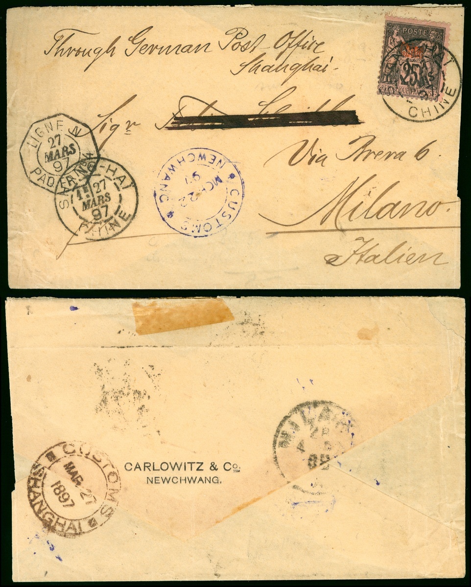 1897 (22 Mar.) Newchwang to Italy cover, bearing French 25c. The sender paid cash as postage, so no baering China stamp on cover with Customs Newchwang c.d.s., transit by Shanghai with 27 Mar. French Post in Shanghai c.d.s. and the same date Costoms Shanghai c.d.s on reverse, than carry by French ship to Italy with 27 Mar. octagonal ship post c.d.s., Italy arrival c.d.s. also on reverse.
