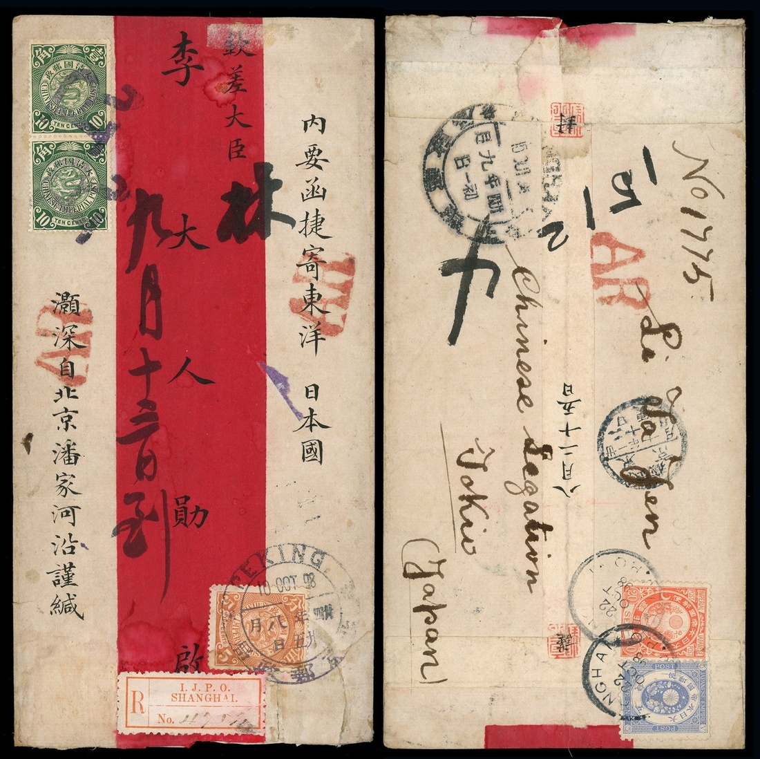 1898 (10 Oct.) a double registered red cover to Japan bearing 5c.,10c.vertical pair tied by ‘ R ‘ and Peking dollar dater c.d.s., on reverse bearing Japan Koban 5sen and 20sen tied by Shanghai I.J.P.O. c.d.s. also red ‘AR ‘ and I.J.P.O. registered label.