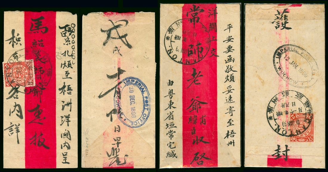 1898-99 Two red band covers from Canton to Wuchow; 1/ 1998 (17 Dec.) Canton to Wuchow, bearing C.I.P. 2c., tied by Canton dollar Dater, on the reverse with Wuchow I.P.O. 20 Dec. Oval c.d.s. in bule; 2/ 1899 (9 Jan.) on the reverse, bearing C.I.P. 2c., tied by Canton dollar dater, 12 Jan. Wuchow I.P.O. ovel c.d.s.in black alongside.