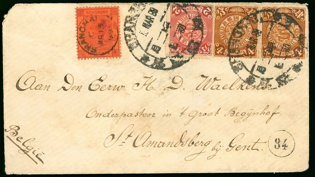 1899 (13 Mar.) envelope to Belgium bearing C.I.P coliling dragon 2c, 4c (2) tied by Shanghai dollar dater, Hong Kong 10s tied by British P.O. in Shanghai c.d.s., with Belgium arrival (15.4). Good cover.