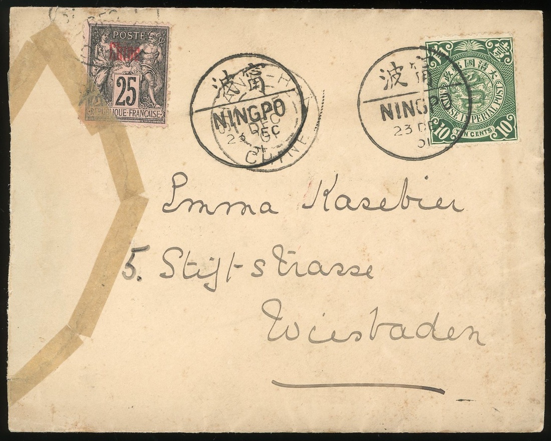 1901 (23 Dec.) a combination cover bearing 10c. tied by Ningpo c.d.s. and mixed France 25c.,on reverse with unclear red Ningpo letter box.