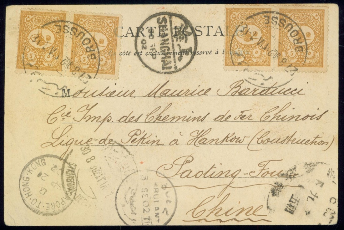 1902 (27 Aug.) incoming picture postcard to Paoting, bearing Turkey 5m (4) tied by Brousee c.d.s., with 'Singapore To Hong Kong' marine sorter 'Sp 21 02' sent on the steamer "Ballaarat" with Shanghai transit (30.9) and Paoting arrival (6.10).