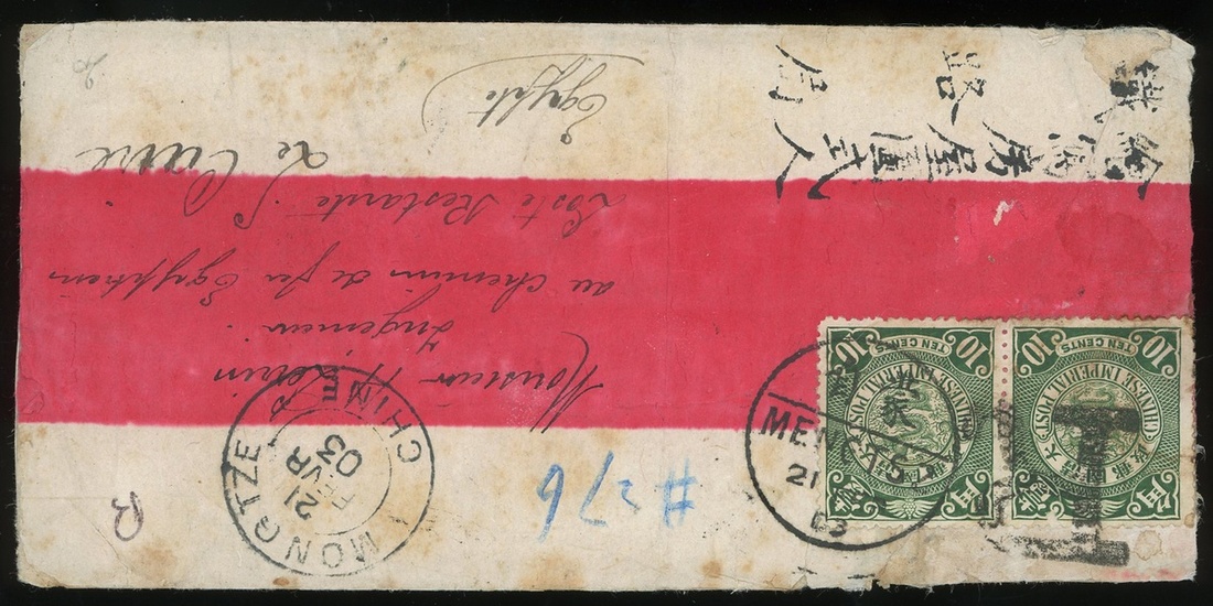 1903 (21 Feb.) a registered red band cover to Egypt bearing 10c. pair tied by ‘ R ‘ and Mengtsz c.d.s. via Hanoi, Singapore and Suez, very scarce postal route.
