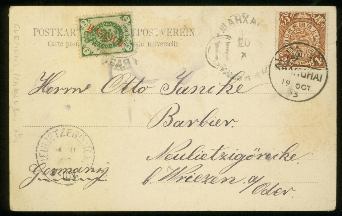 1903 (19 Oct.) "Mixed Court " picture postcard to Germany bearing C.I.P. coiling dragon 4c tied by Shanghai c.d.s. and Arm types of Russia ovpt. "KITAI" diagonally 2k tied by Russian P.O. in Shanghai, one stamp apparently peel off, with arrival c.d.s. Fine.