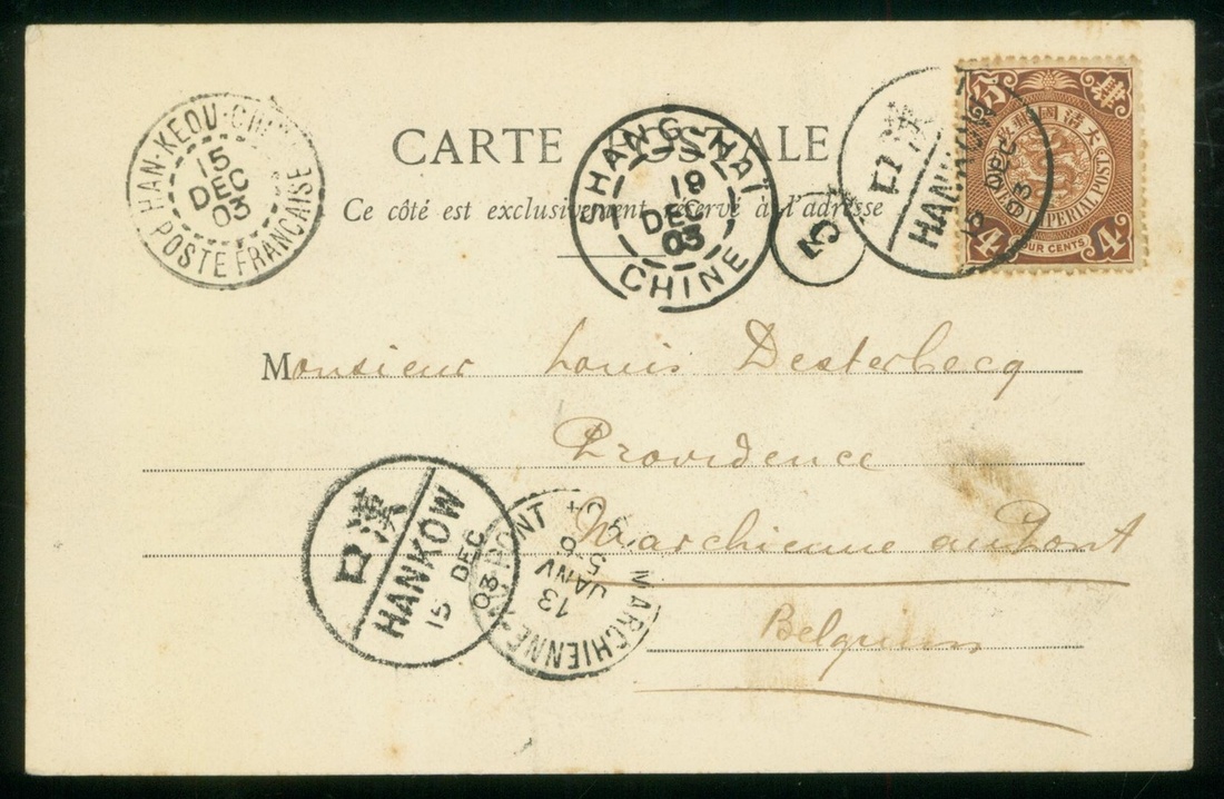 1903 (15 Dec.) picture postcard to Belgium bearing C.I.P. coiling dragon 4c tied by Hankow c.d.s., with French P.O. in Hankow and Shanghai transit c.d.s. and Belgium arrival (13.1). Fine.