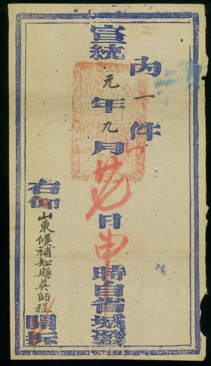 1909 (27 Sep.) a large official envelope from Shantung,fine.