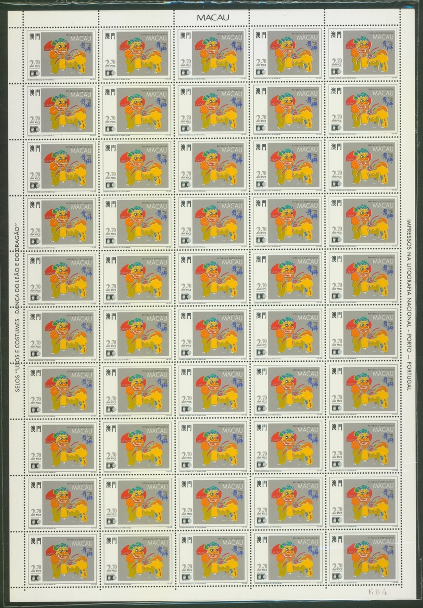 1992 Macau Lion & Dragon Dances, full sheet of 50 stamps, unmounted mint