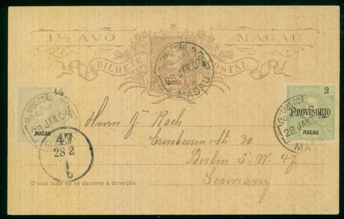 1904 (28 Jan.) Macau 1-½a pre-stamped postcard, f.w. 2 stamps (total rate 4a) to Germany, via Hong Kong, tied by Macau c.d.s. and Germany Lappa Customs c.d.s.