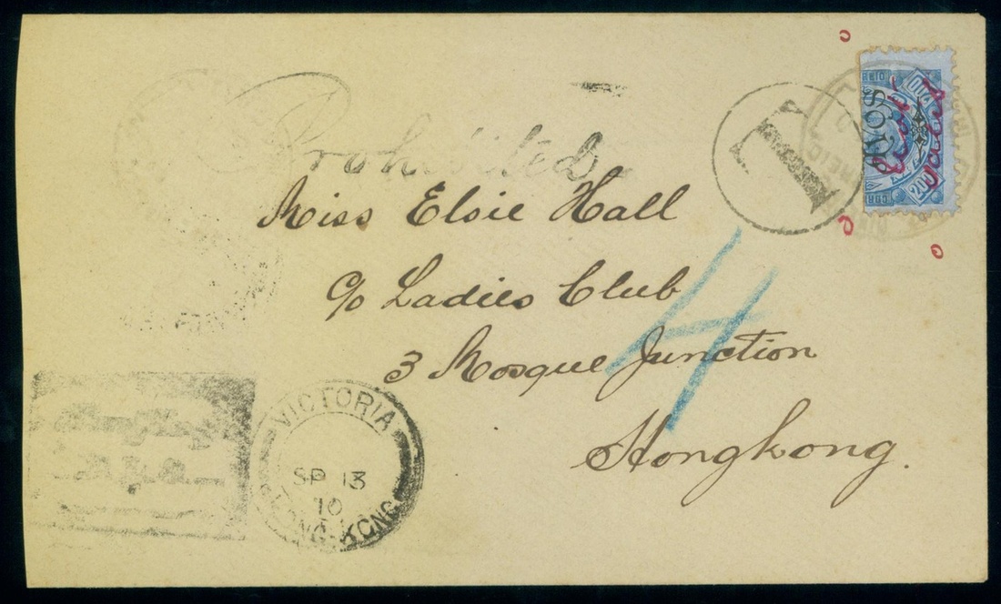 1910 Macau cover to Hong Kong, with lower half of 6a on 200 reis, bisected horizontally, which was not accepted since the original denomination could not be seen, Rare "Prohibited" mark indicating the stamp was invalid, and circled "T" to denote postage due. Also Hong Kong arrival and DLO marks on cover