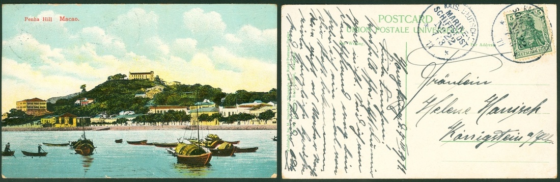 1911 (7 Mar.) Macau Picture Post Card, Penha Hill, sent from Germany, tied by Marine Schiffspost c.d.s.