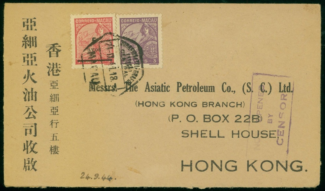 1941 (24 Sept.) Macau cover to Hong Kong, f.w. Padroes 3a & single line surcharge 5a on 7a, tied by Macau c.d.s. and with boxed censor mark