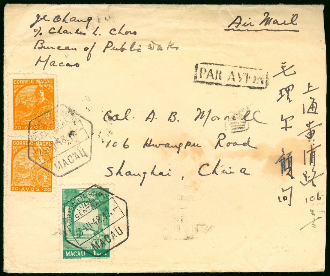 1948 (23 Dec.) Macau cover to Shanghai by airmail post, f.w. 2 x 20avos Padroes + 1P Gate stamps, tied by Macau c.d.s. and Shanghai arrival c.d.s. on reverse
