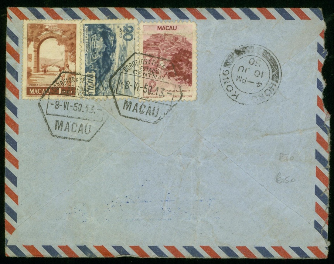 1950 (8 Jun.) airmail envelope to Canada bearing Macau 2a, 20a, 1p tied by Macau c.d.s. with postal instruction h.s. "By Air to London only".