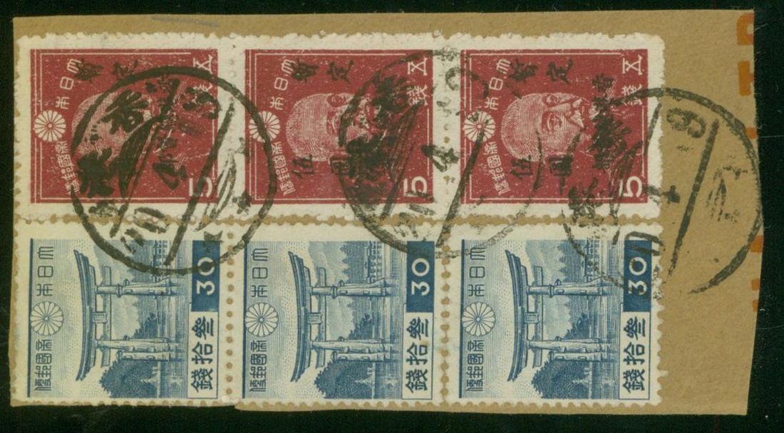 1943 -45 Japan Occupation of Hong Kong 30 sen strip of 3 & 5 Yen on 5 sen strip of 3, used on piece, tied by Hong Kong 20.4.19 c.d.s.