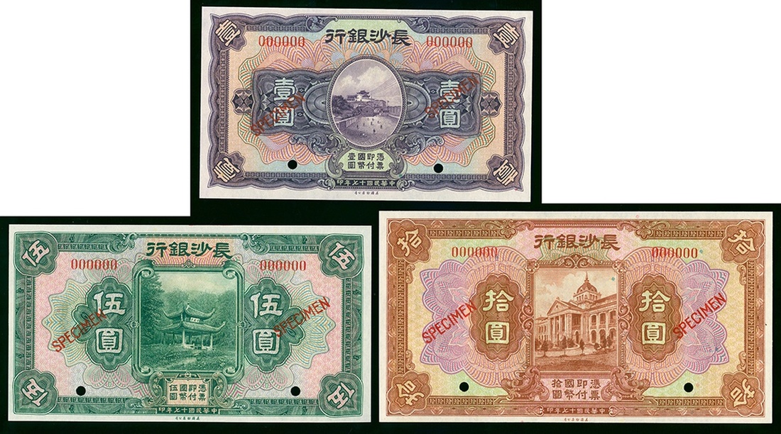 Changsha Bank, set of 3 specimens, 1928, consisting of 1, 5 and 10 yuan, printed by ABNC,
