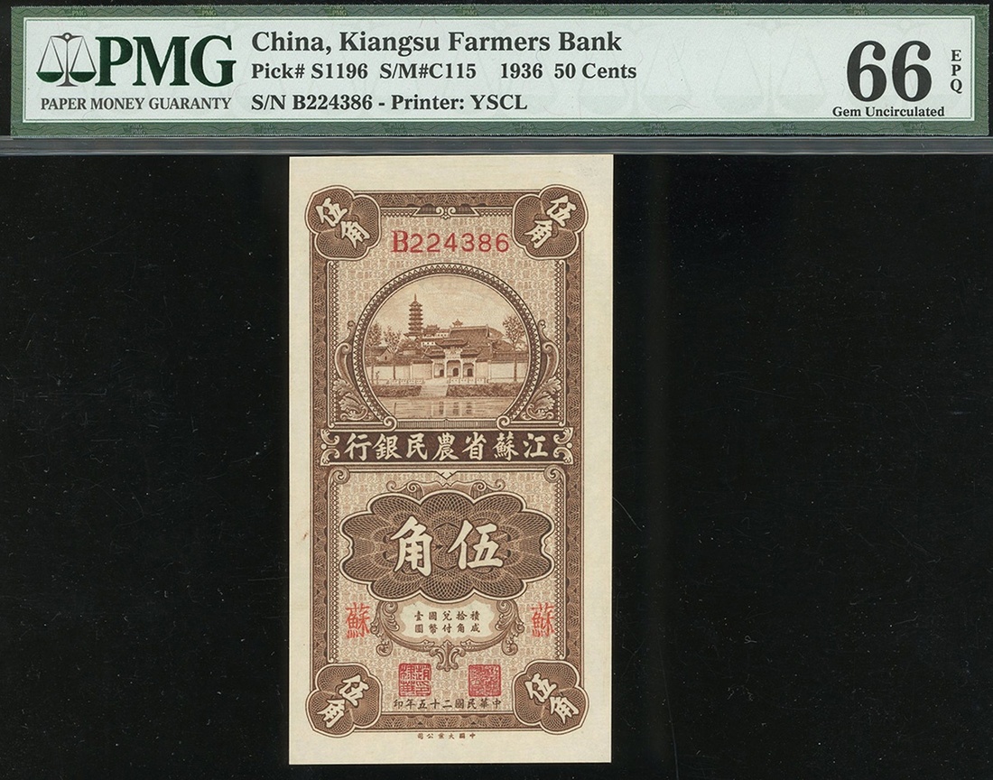 Kiangsu Farmers Bank, 5 Jiao, 1936, serial number B224386, (Pick S1196), PMG 66EPQ Gem Uncirculated