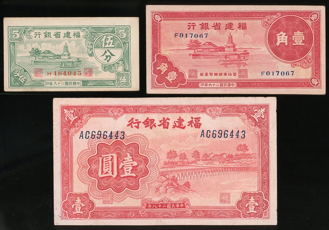 Provincial Bank of Fukien, a lot of 5 fen, 1 chaio and 1 yuan, 1937, 1939 and 1940, serial number H484045, F0170067 and AC696443 respectively, (Pick S1416, S1412, S1420), foxing, about uncirculated to uncirculated.(3)