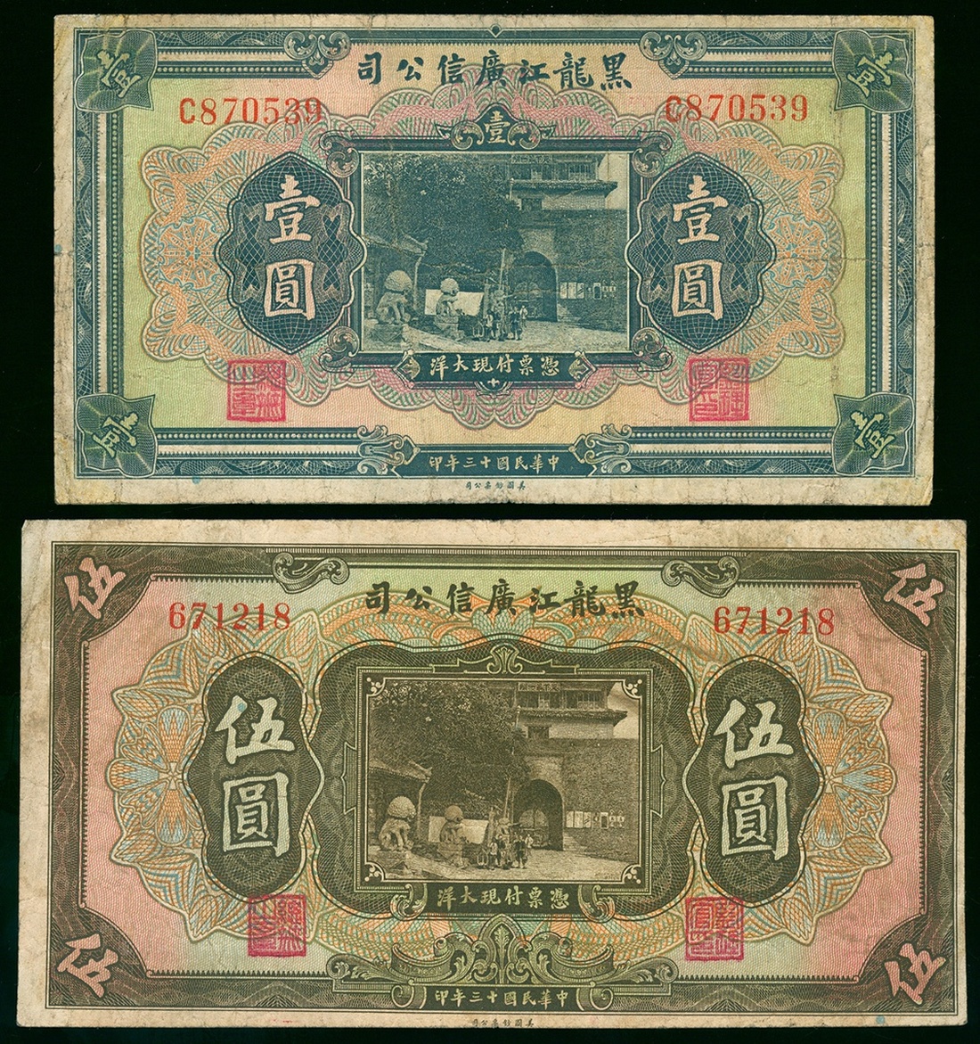 1924黑龍江廣信公司1元及5元兩枚,編號C870539及671218,G品相,有修補